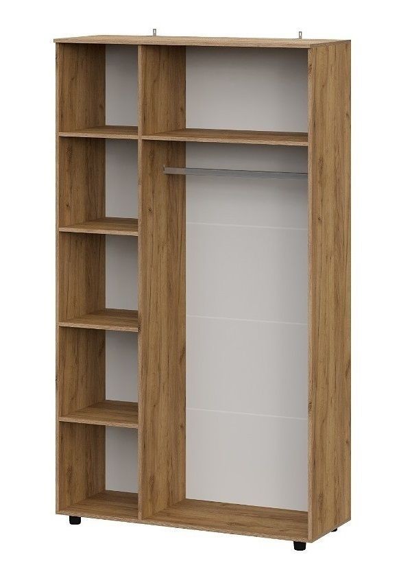 В левой части шкафа расположен отсек с четырьмя полками (одна стационарная и три съемных), в правой части шкафа расположен отсек со стационарной полкой и штангой (присадка под штангу отсутствует, покупатель устанавливает ее самостоятельно).